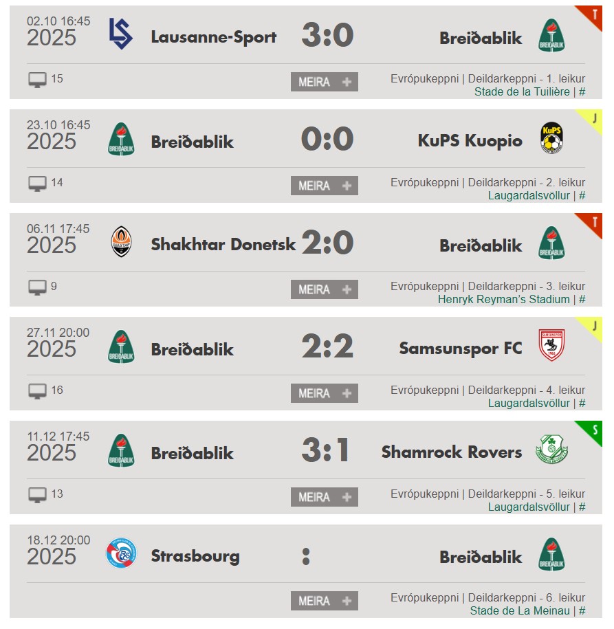2023 Europa Conference League (Sambandsdeild) - Play-offs 24 & 31 August. 1st leg. FC Struga - Breiðablik . 2nd leg. Breiðablik - FC Struga . Group stage (Group B). Sep 21st. Maccabi.Tel Aviv - Breiðablik. Oct 5th. Breiðablik - Zorya Luhansk. Oct 26th. KAA Gent - Breiðablik. Nov 9th. Breiðablik - KAA Gent. Nov 30th. Breiðablik - Maccabi Tel Aviv. Dec 14th. Zorya Luhansk - Breiðablik.