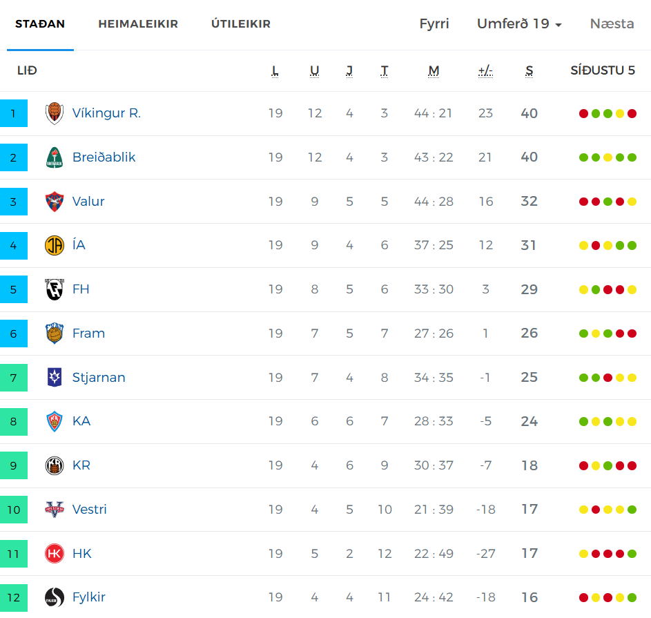Staðan í deildinni fyrir leiki helgarinnar. Blikaliðið í 2. sæti með jafn mörg stig og efsta liðið - ÍA í 4. sæti með 31 stig: