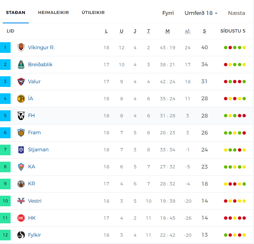Stigataflan fyrir leikinn á fimmtudaginn: Blikar í 2. sæti með 34 stig - Valur í 3. sæti með 31 stig.