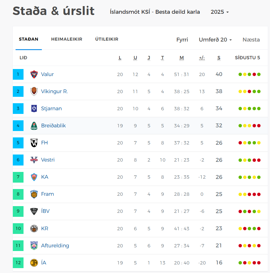 Staðan í Bestu deild karla eftir 20 umferðir er að Blikar eru í 4. sæti með 32 stig eftir 19 leiki – 6 stigum á eftir heimaliðinu sem er í 2. sæti eftir 20 leiki. Ljóst er að okkar menn þurfa að landa 3 stigum á sunnudaginn og koma sér upp í 3. sætið.