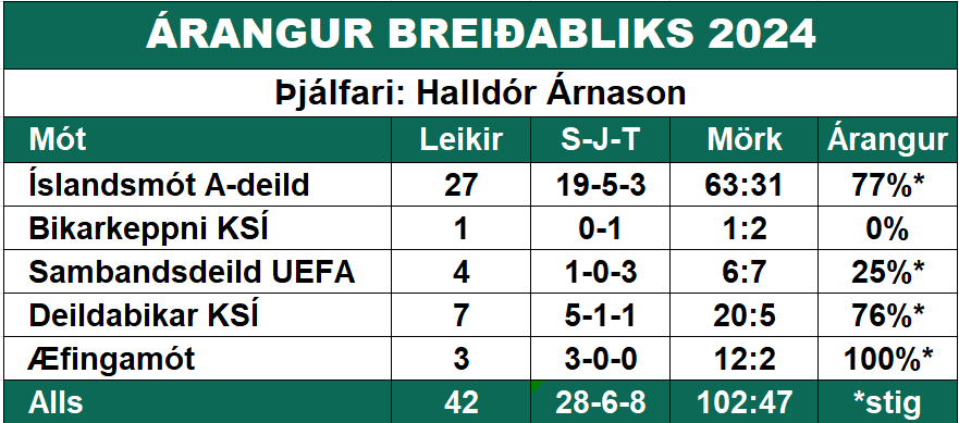 Blikaliðið skorði 63 mörk gegn 31 í Bestu deildinni 2024. Alls skoraði liðið 102 mörk í 42 mótsleikjum á árinu 2024. Dreifing: Besta deild, 63 mörk. Mjólkurbikarinn, 1 mark. Sambandsdeild UEFA, 6 mörk. Lengjubikarinn, 20 mörk. Æfingamót, 12 mörk. Höskuldur Gunnlaugsson fyrirliði og framherjinn Ísak Snær Þorvaldsson skorðu 9 mörk hvor í Bestu deildinni. Höskuldur varð markahæstur í öllum mótsleikjum með 12 mörk, Jason Daði næstur með 11 mörk og Ísak Snær varð þriðji markahæsti með 10 mörk.