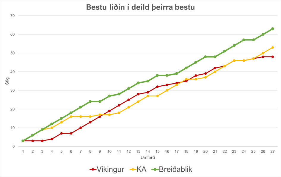 Svipbrigði þjálfarans í viðtölum eftir hvern einasta af átta fyrstu leikjum mótsins voru í engu samræmi við árangurinn. Alvörugefinn Óskar Hrafn samgladdist Ísaki Snæ að skora en það væri ekkert gefið (ekki einu sinni alvörugefið). Ef þú efast um að þessi einbeitta byrjun hafi haft áhrif á framhaldið, skoðaðu þá þetta línurit, sem sýnir stigasöfnun efstu þriggja liðanna, umferð fyrir umferð. (Þær voru ekki allar spilaðar í tímaröð en það breytir ekki neinu.)