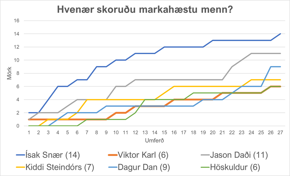 Þvílík veisla framan af móti. Við vorum með heitasta lið deildarinnar og heitasta markaskorara deildarinnar. Rétt eins og önnur lið einbeittu sér að því að ná einhverju út úr leikjum gegn Breiðabliki, einbeittu varnarmenn um gervalla Bestu deildina sér að því að stoppa Ísak Snæ. En þá tóku bara aðrir við og svona lítur töluleg samantekt á skorun okkar markheppnustu manna út nú í sumar í Bestu deildinni, eftir umferðum. Hérna eru mörk þeirra sem skoruðu fleiri en fimm mörk á tíðinni.