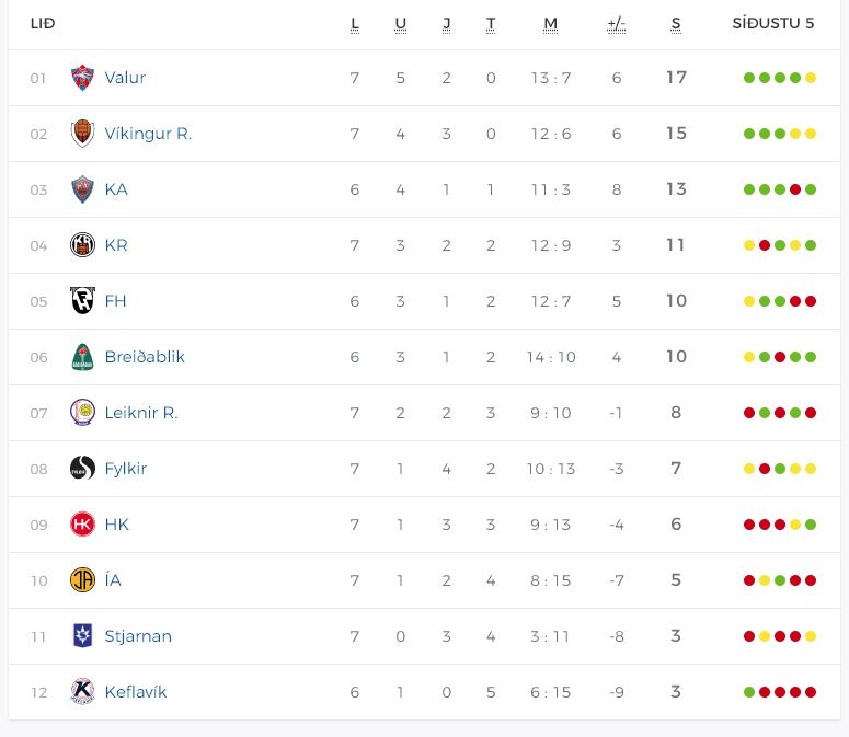 Svona lítur stöðutaflan út eftir 7 umferðir - leik Blika í 7. umferð gegn KA fyrir norðan hefur verið frestað til 29. júlí.