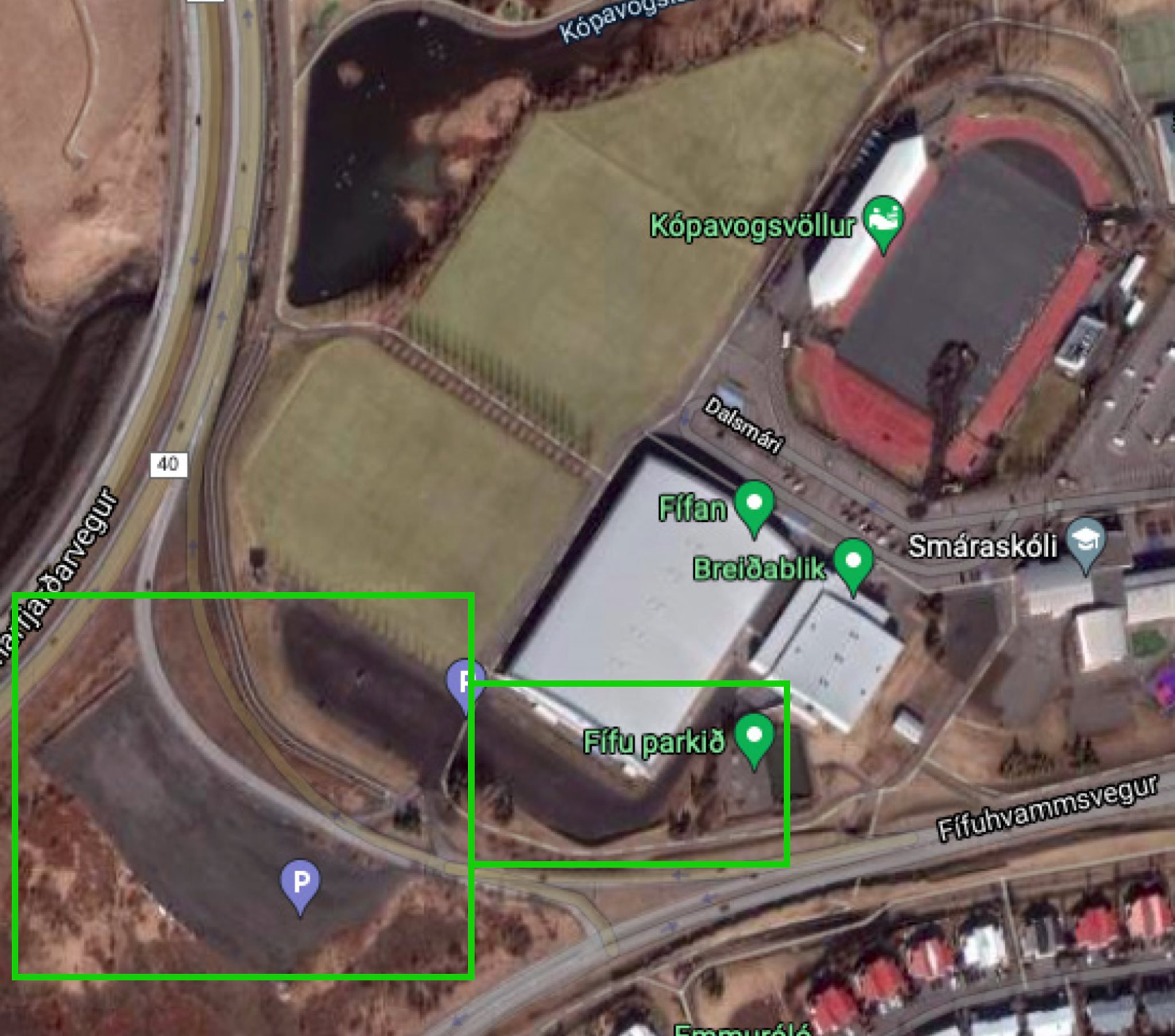 ATH. Að þennan sama dag fara fram kosningar í Smáranum. Við viljum því biðja áhorfendur að koma gangandi eða á hjóli á völlinn. Ef það gengur ekki, að leggja þá bílunum sínum á stæðum fyrir aftan Fífuna, sjá mynd.