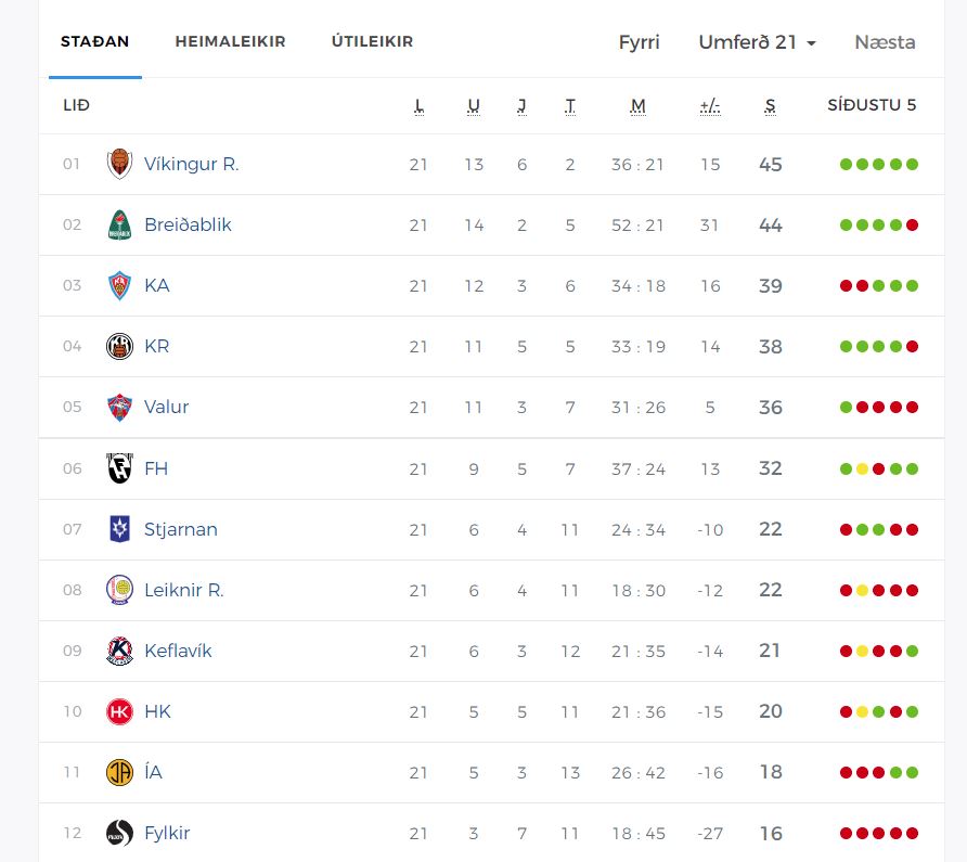 Svona er stöðutaflan fyrir lokaumferðina. Blikaliðið í 2. sæti með 44 sitg og tryggt Evrópusæti 2022. HK-ingar eru í 10 sæti með 20 stig og þurfa að treysta á sigur Keflvíkinga á ÍA og/eða ná jafntefli eða betra gegn Blikaum, til að halda sæti sínu í deildinni.