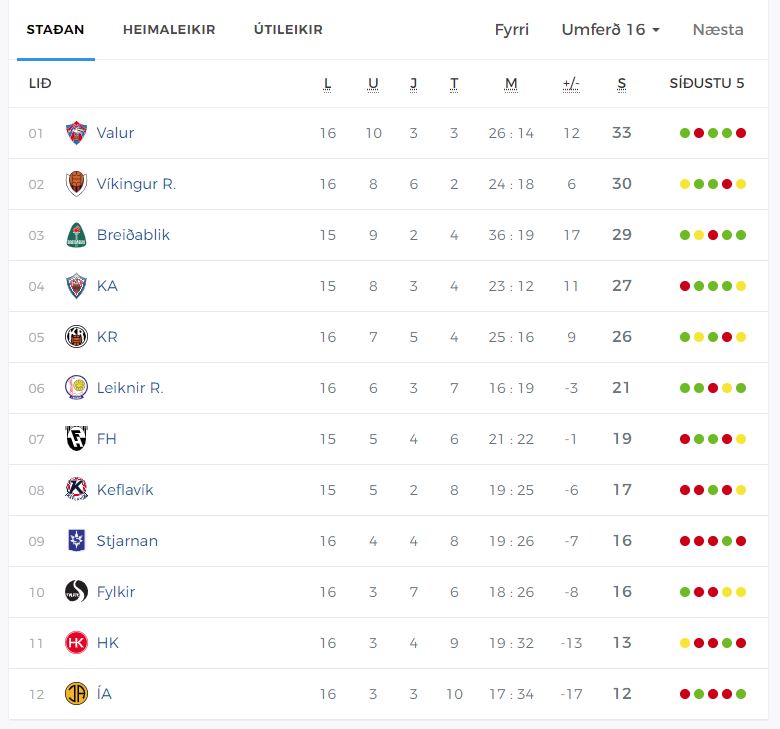 Svona lítur stöðutaflan út fyrir 17.umferð. Blikar eiga leik til góða gegn KA.
