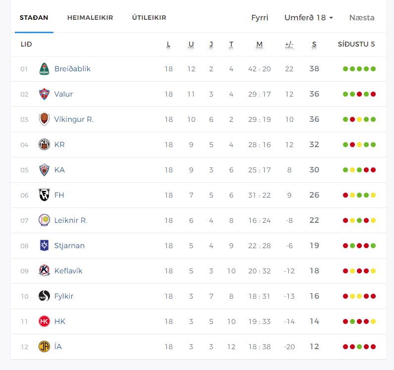 Svona lítur stöðutaflan út eftir 18 umferðir - Blikar einir á toppnum eftir sigurleik gegn KA á Akureyri í vikunni.