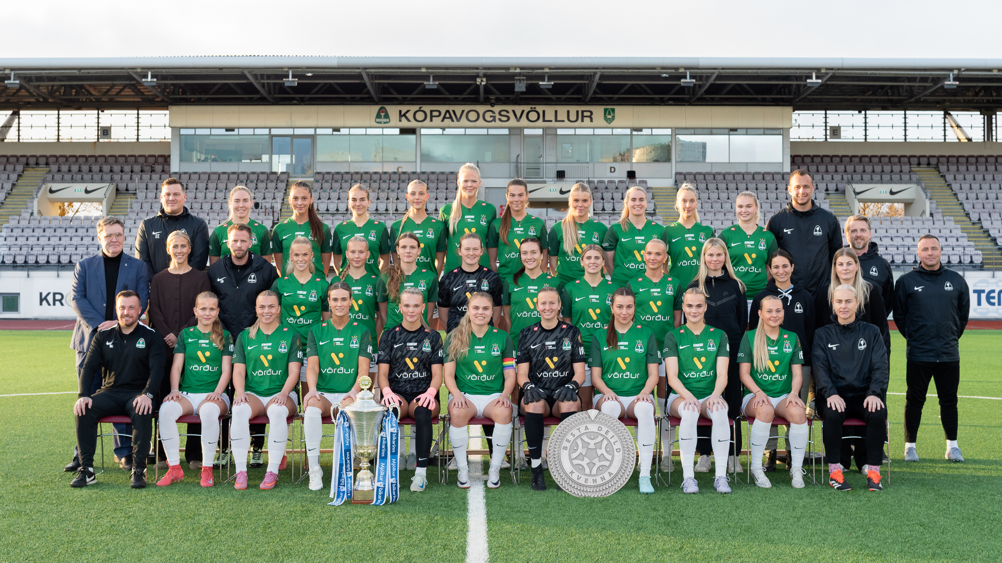 Miðröð f.v.: Flosi Eiríksson formaður knattspyrnudeildar, Tanja Tómasdóttir framkvæmdastjóri, Sævar Örn Ingólfsson styrktarþjálfari, Sunna Rún Sigurðardóttir, Líf Joostdóttir van Bemmel, Edith Kristín Kristjánsdóttir, Kyla Burns, Sammy Smith, Heiða Ragney Viðarsdóttir, Andrea Rut Bjarnadóttir, Eyrún Ingadóttir liðsstjóri, Ana Cate liðsstjóri, Ragna Björg Einarsdóttir formaður meistaraflokksráðs kvenna, Valdimar Valdimarsson markmannsþjálfari.