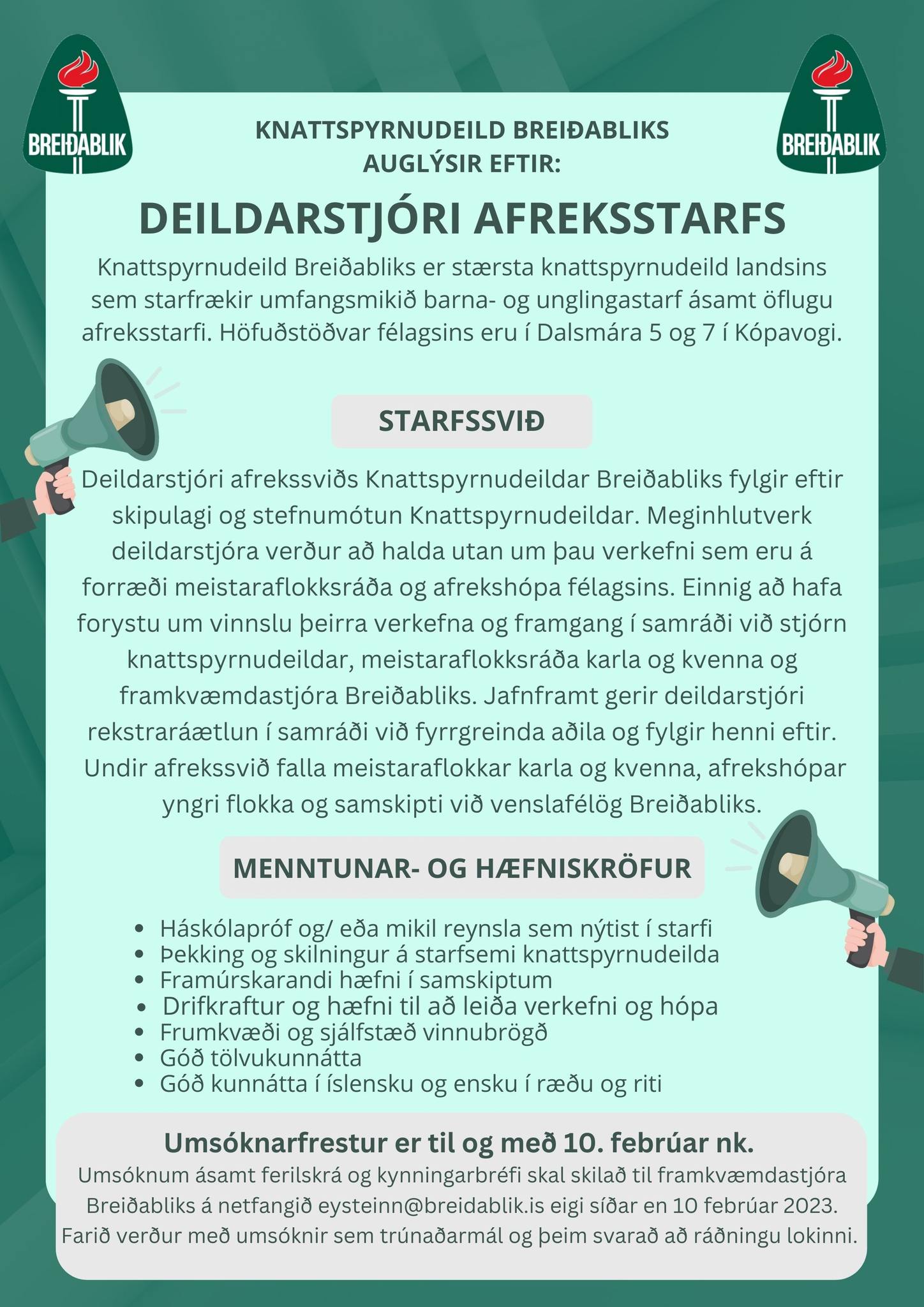 Knattspyrnudeild Breiðabliks leitar nú að öflugum einstaklingi til að verða deildarstjóri afrekssviðs deildarinnar. Hér áður fyrr hét starfið framkvæmdastjóri knattspyrnudeildar en með auknum umsvifum þá er komin meiri sérhæfing í félagið okkar. Þetta er örugglega eitt mest spennandi starf sem er í boði á markaðinum í dag en um leið mjög krefjandi. Ert þú manneskjan sem Blikar eru að leita að?