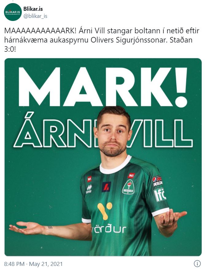 Árni sem hafði áður í leiknum komist í dauðafæri en brennt af skilaði heldur betur til baka á 74. mín. Oliver kom þá með flotta aukaspyrnu frá hægri væng, Árni tók djúpt hlaup og hlóð í glæsilegan flugskalla sem endaði í netinu. Geggjað mark. Takk Árni.