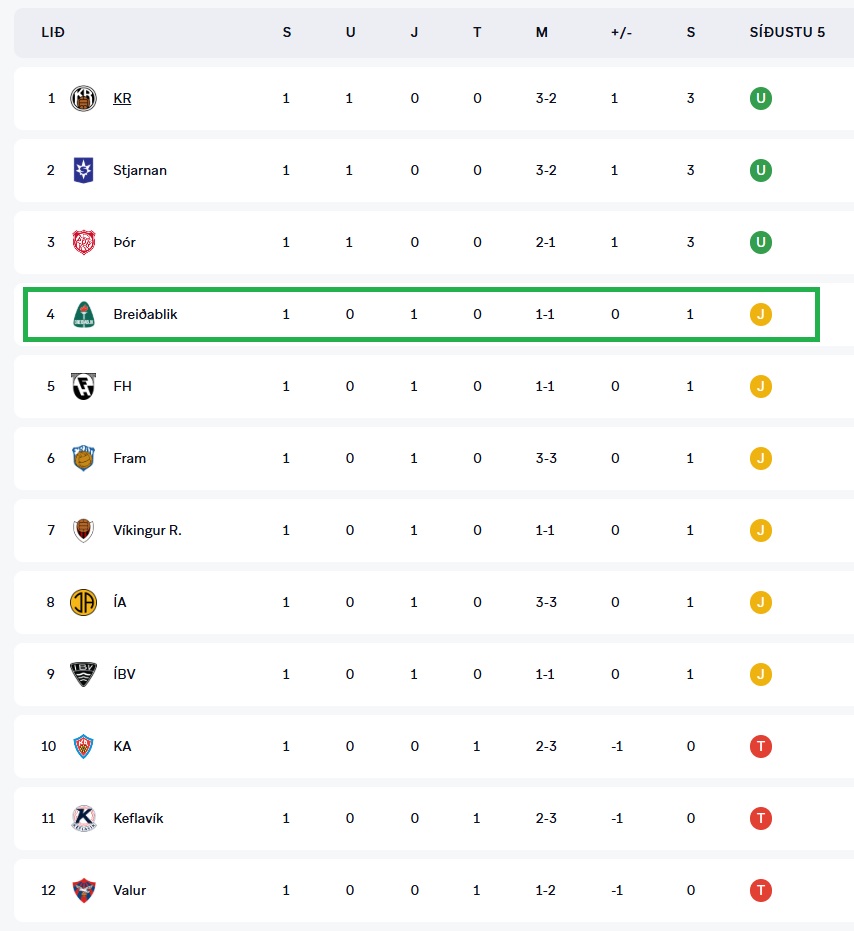 Stigataflan eftir fyrstu umferð - Blikar í 4. sæti