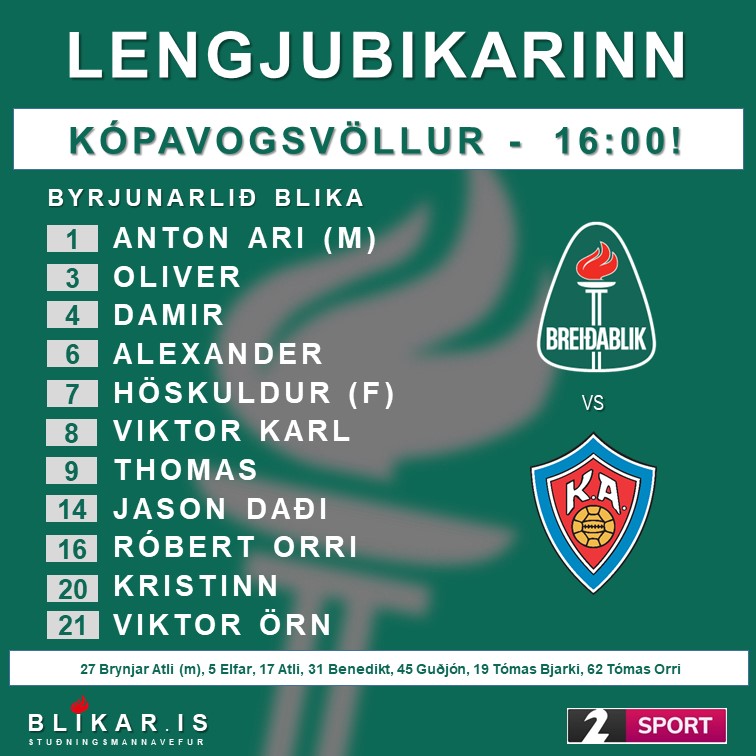 Blikaliðið er komið í undanúrslit Lengjubikarsins með 2:1 sigri á gulklæddum KA-mönnum. Það voru stórglæsileg mörk frá þeim Jasoni Daða Svanþórssyni og Viktori Karli Einarssyni undir lok fyrri háfleiks sem tryggðu okkur þetta sæti. Við hleyptum gestunum inn í leikinn með klaufalegu marki fljótlega í seinni hálfleik en náðum sem betur að halda markinu hreinu það sem eftir lifði leiks. Við mætum Keflvíkingum i undanúrslitum á Kópavogsvelli 1. apríl kl.16:00.