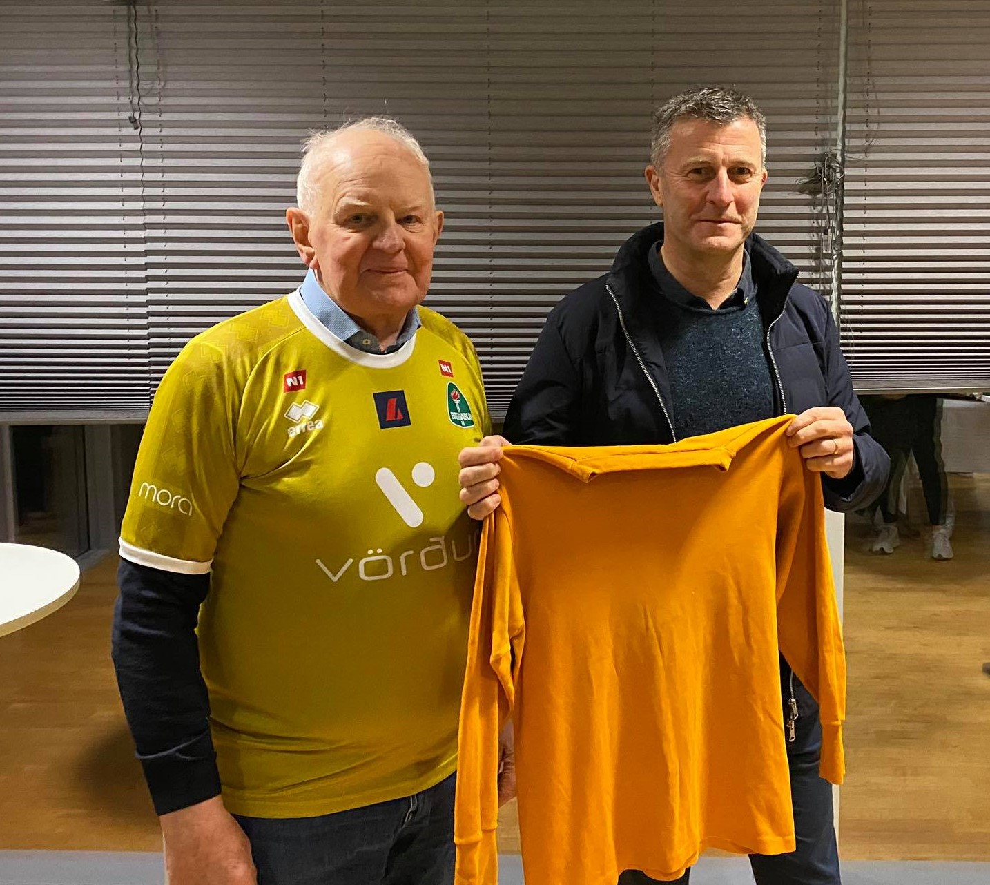 Logi Kristjánsson var markvörður Blikaliðsins frá 1966 til 1969. Hann spilaði alltaf í gulri treyju og hvítum buxum. Logi var heiðursgestur á leiknum í gærkvöld. Fyrir leikinn færði Logi deildini gömlu treyjuna sína að gjöf og Orri Hlöðversson færði Loga eintak af treyjunni sem Anton Ari spilaði í leiknum.