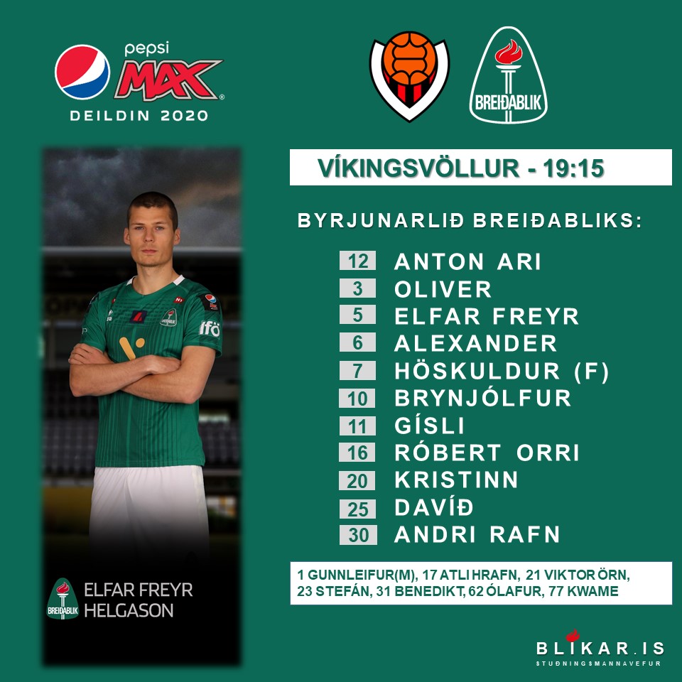 Brynjólfur Andersen leiddi framlínuna og KD20 stóð vaktina fyrir aftan Binna. Á vængjunum voru Davíð og Höggi capitano. Miðjan samanstóð af Gísla Eyjólfssyni, Alexander Helga og Andra Rafni. Í vörninni voru Oliver, Elfar Freyr og Róbert Orri. Anton Ari að sjálfsögðu í rammanum.