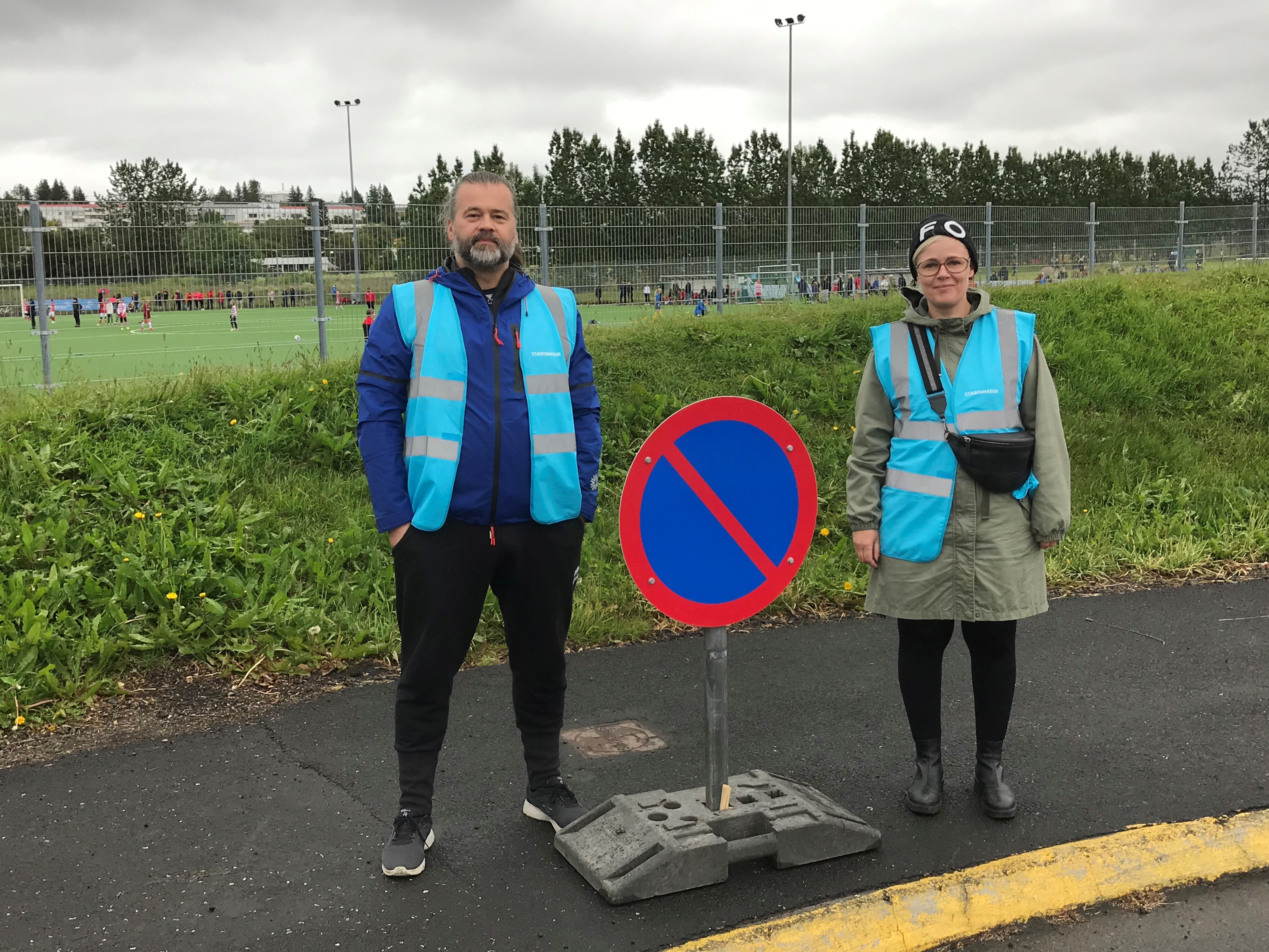 Hér eru 2 af 450 sjálfboðaliðum Símamótsins. Umferðaverðir i Fagralundi. Þau sögðu að foreldrar almennt væru afar ánægðir með framkvæmdina og ekki síst “hólfaskiptinguna”. Besta Símamótið frá upphafi.