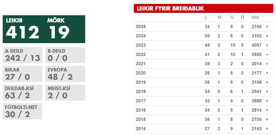 Heildarleikjafjöldi hans með fjórum liðum í öllum keppnismótum eru nú 590 leikir, sem skiptast svona: A-deild: 280. B-deild: 36. C-deild: 9. D-deild: 25. Bikarkeppni: 37. Deildabikar: 101. Reykjavíkurmót: 3. Meistarkeppni: 2. Evrópuleikir: 48. Vormót: 35. DPMM (Singpúr): 14. Samtals: 590 mótsleikir.