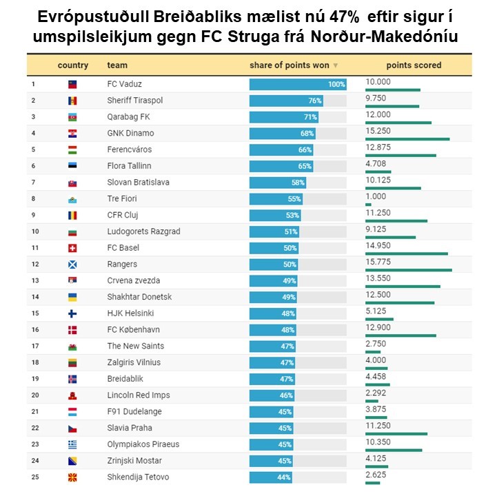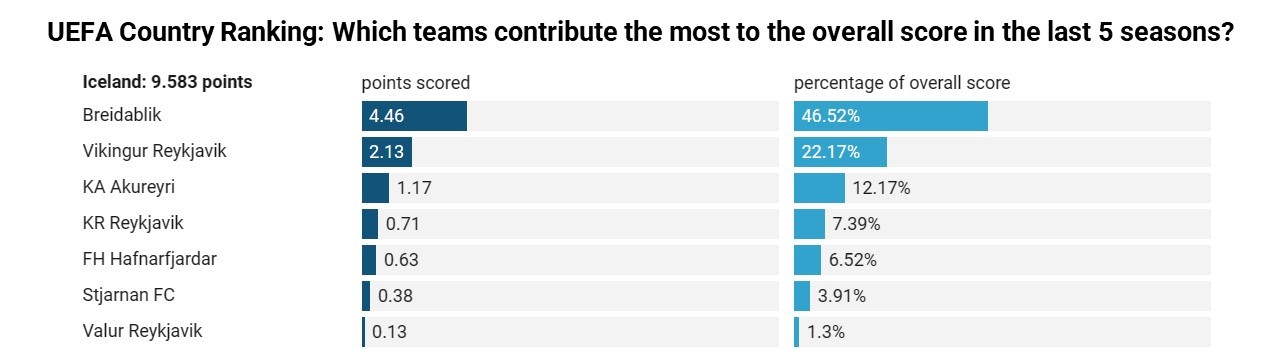 Nýtt viðmið um árangur íslenskra félagsliða hefur litið dagsins ljós hjá Breiðabliki og félagið er í fararbroddi þegar kemur að árangri íslenskra liða á alþjóðlegum vettvangi. Myndin hér að neðan sýnir þetta glögglega. Breiðablik er fánaberi íslenskra liða og hefur tryggt Íslandi sess í Evrópukeppni umfram önnur félög. Nær helmingur af þeim árangursstigum sem mæla gæði þjóða á knattspyrnusviðinu á Íslandi kemur frá Breiðablik undanfarin 5 ár skv. meðfylgjandi tölum (frá UEFA).