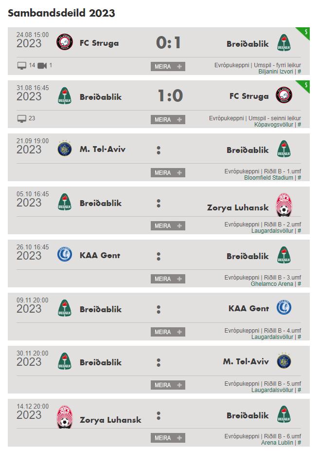 Umspil - Breiðabliksliðið mætti FC Struga frá N.Makedóníu í 2 upspilsleikjum um sæti í riðlakeppni Sambandsdeildar UEFA 2023/24. Fyrri leikuinn fór fram úti og lauk með sigri okkar manna 0:1. Nánar um leikinn: Magnað í Norður-Makedóníu! Blikar unnu einnig eins marks sigur í síðari leikinn sem fór fram á Kópavogsvelli 31. ágúst 2023. Nánar um leikinn: Bimm bamm bimm bamm bimbirimbi bimm bamm!